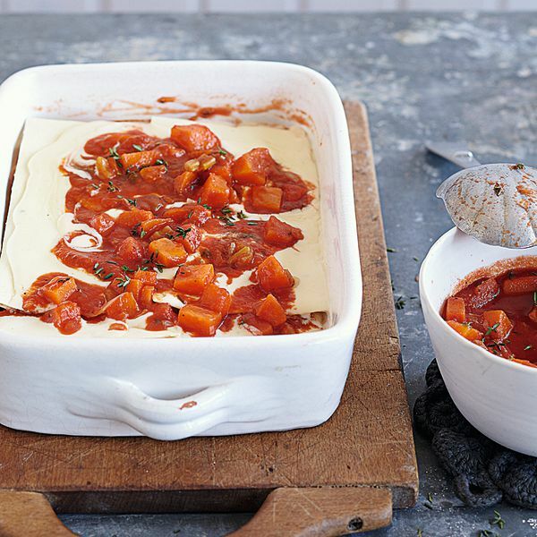 Ein Auflauf, der nicht nur vegetarische Gäste begeistert: geschichtet mit Kürbis-Tomaten-Sugo, Lasagneblättern und Käse-Béchamelsauce.