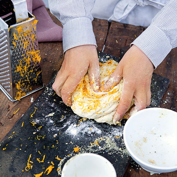 Das Mehl in eine Schüssel sieben und eine Mulde hineindrücken. Die zerbröckelte Hefe und 2 EL Milch in die Mulde geben und mit etwas Mehl vom Rand glatt rühren. Den Vorteig mit einem sauberen Küchentuch abdecken und an einem warmen Ort ca. 20 Min. gehen lassen. Anschließend mit der restlichen Milch, Salz, Zucker, Orangenschale und Butter zu einem glatten Teig kneten. Diesen wieder abgedeckt 50 Min. gehen lassen.