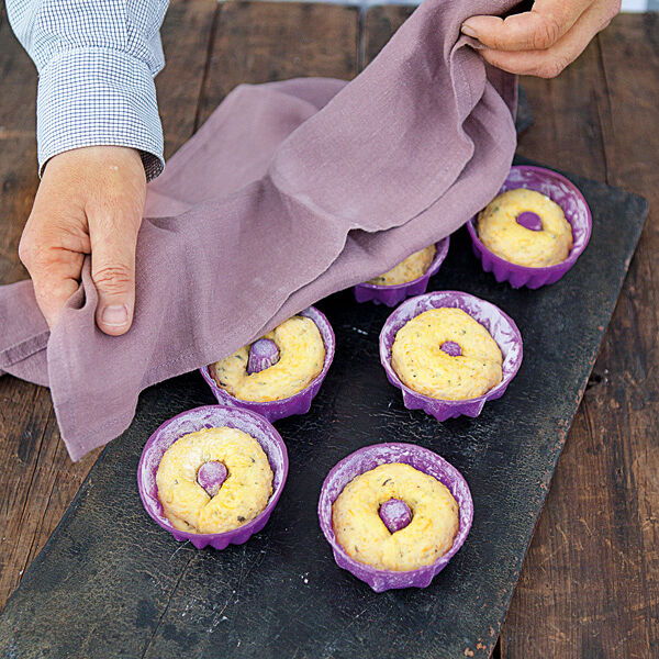Den Kürbis auf der Gemüsereibe fein raspeln. Mit den Walnüssen und Kürbiskernen unter den Teig kneten. Den Teig in sechs Stücke teilen, jedes zu einer Rolle von ca. 15 cm Länge formen und in die Förmchen legen. Den Teig in den Förmchen abgedeckt nochmals 20 Min. gehen lassen. Inzwischen den Backofen auf 200° vorheizen.