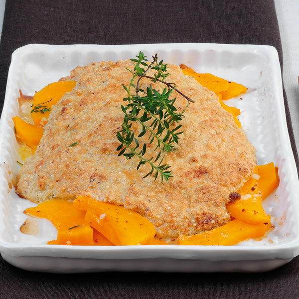 Die Eier trennen, die Eiweiße mit einer Prise Salz steif schlagen. Quinoa mit restlicher Butter, Eigelben und Oregano mischen. Eischnee, Nüsse und Käse unterheben. Die Masse auf den Kürbis streichen. Das Gratin im heißen Backofen (Mitte, Umluft 160°) 25-30 Min. garen.