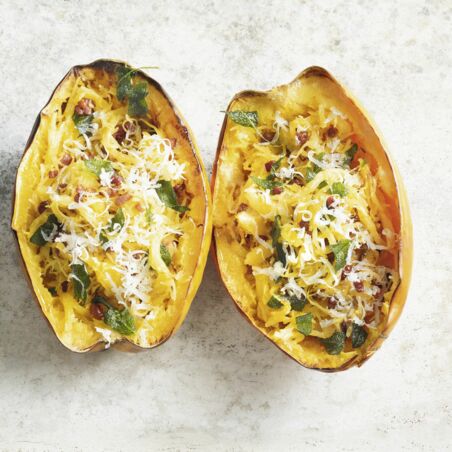 Inzwischen Parmesan fein reiben. Die Speck-Mischung auf die Kürbis-Spaghetti geben, alles behutsam vermengen. Mit Salz und Pfeffer abschmecken, mit Parmesan bestreuen und gleich servieren.