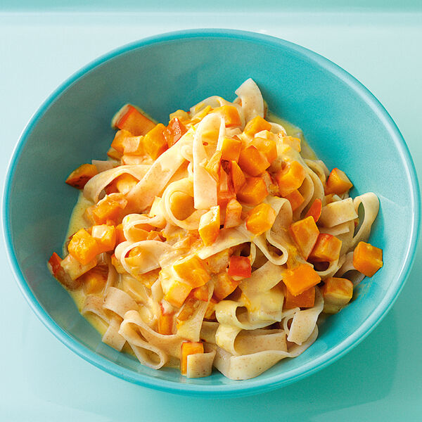 Nudeln ins kochende Wasser geben. Das Öl in einer Pfanne erhitzen, die Kürbiswürfel, Salz und Kurkuma zugeben und kurz anbraten. Mit der Kokosmilch ablöschen. Ingwer schälen und durch die Knoblauchpresse dazudrücken. Alles zugedeckt 10 Min. dünsten.