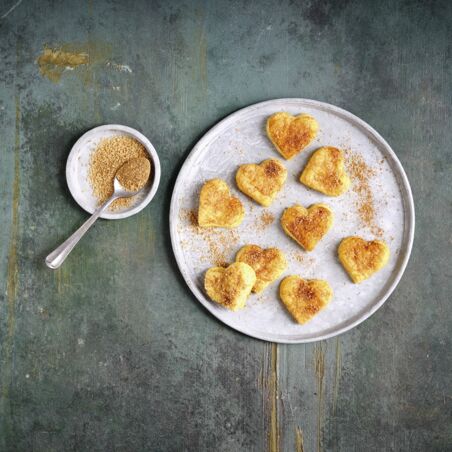 Den Backofen auf 180° vorheizen, zwei Backbleche mit Backpapier belegen. Zucker und Zimt mischen. Den Teig dritteln und jede Portion auf der bemehlten Arbeitsfläche ca. 4 mm dick ausrollen. Jeweils ein Drittel vom Zimtzucker gleichmäßig daraufstreuen und mit der Hand festdrücken. Dann aus den Teigplatten mit dem Ausstecher Herzen ausstechen und auf die Bleche legen.