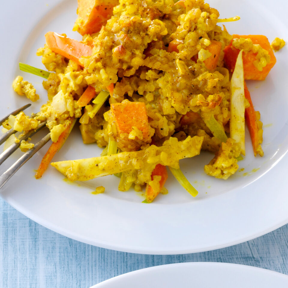 Ziegenquark und Eier verrühren. Bulgur, Kürbis, Garam Masala, Kurkuma, Cashewnusskerne, Salz und Pfeffer untermischen.