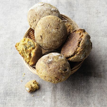 Einen Bogen Backpapier bereitlegen. Den Teig auf der stark bemehlten Arbeitsfläche in acht Stücke teilen. Jedes Teigstück mit leicht bemehlten Händen zu einem runden Brötchen rollen, diese auf das Backpapier setzen und leicht flach drücken.