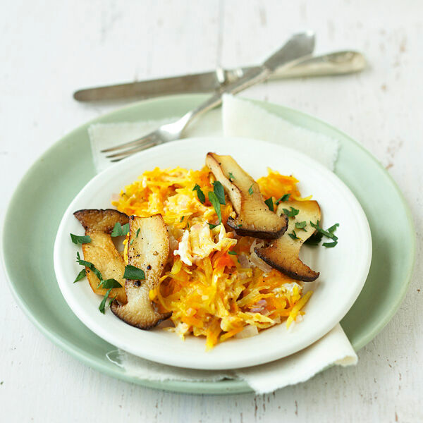 Das Kürbisgemüse mit Zimtpulver, Cayennepfeffer und Salz abschmecken. Den Frischkäse unterrühren. Das Gemüse mit den Pilzen anrichten und mit Petersilie bestreuen.
