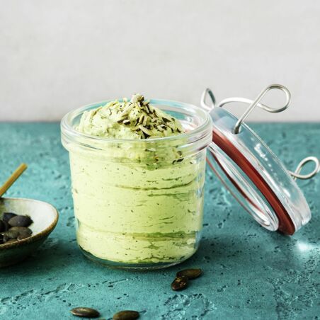 Ein herrlich erfrischender Brotaufstrich aus Kürbiskernen, Magerquark und Frischkäse.