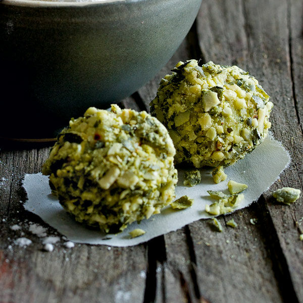 Zum Überziehen Kuvertüre hacken, schmelzen und temperieren. Übrige Kürbiskerne auf einen Teller geben. Trüffelspitzen flach drücken. Trüffel mit Kuvertüre überziehen, in Kürbiskernen wenden, auf Backpapier fest werden lassen.
