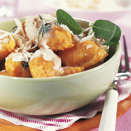 Die Kürbisnockerl mit dem Schaumlöffel aus dem Wasser heben und gleich in vorgewärmte tiefe Teller verteilen. Die Salbeisahne darüber löffeln. Fertig!