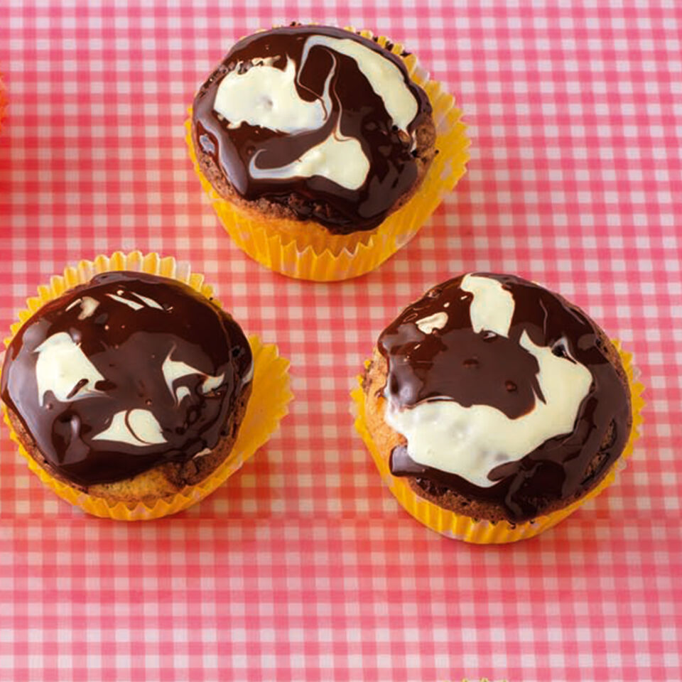 Die weiße Kuvertüre in einem Topf bei kleiner Hitze unter Rühren schmelzen. Kuvertüre mit einem Kaffeelöffel als Kuhflecken auf die Muffins setzen, antrocknen lassen. Dann die Zartbitter-Kuvertüre bei kleiner Hitze schmelzen und als Kuhflecken zwischen die weißen Kleckse setzen. Trocknen lassen.