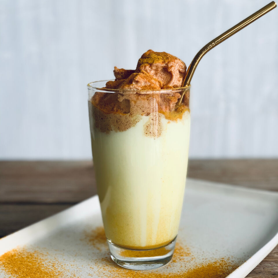 Dalgona Coffee mit Eiweißhäubchen gibt es in allen möglichen Varianten. Diese hier erinnert an klassische goldene Milch, nur besser.