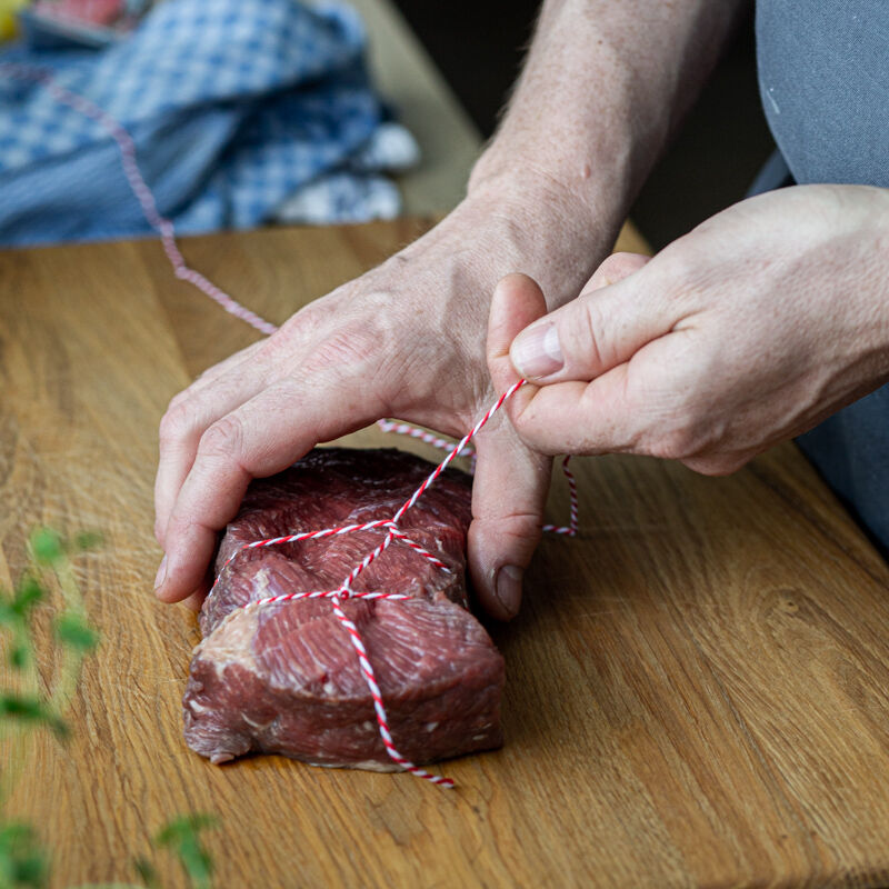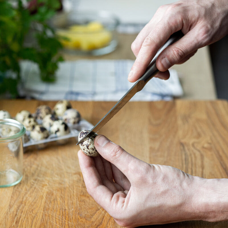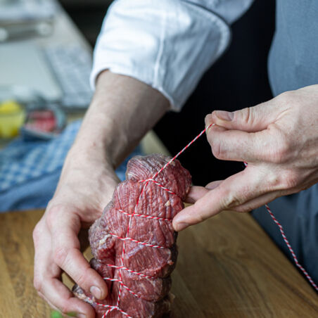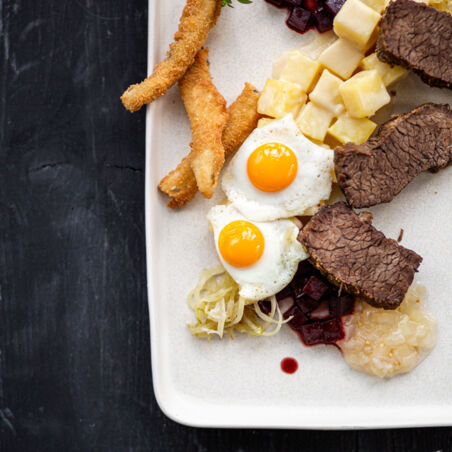 Zart geschmolzene Ochsenbrust mit Schmelzkartoffeln, blonden Zwiebeln, glasierten Rote Bete-Würfeln, gebackenem Heringsfilet, Wachtel-Spiegelei und saurem Gurkenrelish.