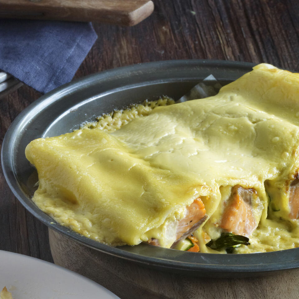 Die Cannelloni sind mit aromatischem Lachsfilet gefüllt und garen zwischen Nudelblättern in einer feinen Crème-fraîche-Senf-Sauce.