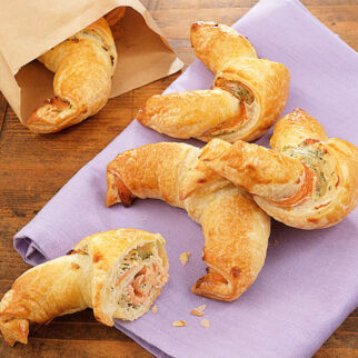 Lachs auf die Teigstücke legen. Mit der Creme bestreichen. Von der breiten Seite zur Spitze hin aufrollen. Auf Backpapier legen. Eigelb und Milch verquirlen. Croissants damit bestreichen. Im Backofen (Mitte, Umluft 200°) ca. 20 Min. backen.