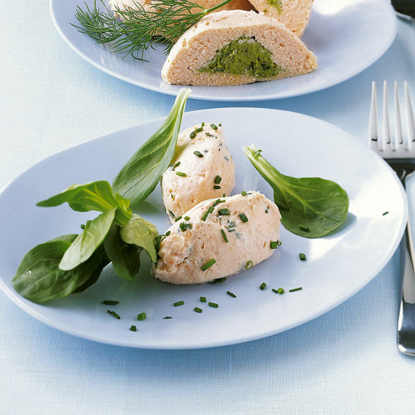 Feldsalat putzen und waschen. Mit 2 Esslöffeln Nocken von der Lachsmousse abstechen und mit dem Feldsalat auf Tellern anrichten. Mit dem übrigen Schnittlauch bestreuen. Dazu passt Baguette und ein fruchtiger Weißwein.