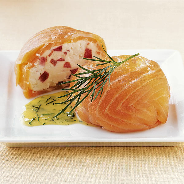 Blechmulden erst mit Klarsichtfolie, dann mit Lachs, bis über den Rand lappend, auslegen. Paprika waschen, putzen und fein würfeln. Käse und Quark glatt rühren, salzen und pfeffern. Paprika unterrühren. Masse in den Mulden verteilen. Lachs darüber schlagen. Zugedeckt 2 Std. kühl stellen.