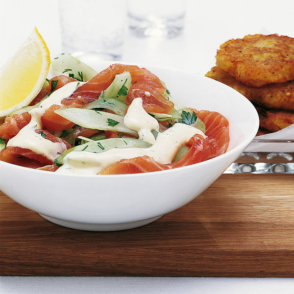 Die Kräuter waschen, trockenschütteln und fein hacken. Die Räucherlachsscheiben voneinander lösen und in etwa 1 cm breite Streifen schneiden. Senf mit süßer Sahne, saurer Sahne und Zitronensaft mischen. Mit Gurke, Lachs und Kräutern verrühren, mit Salz und Pfeffer würzen.
