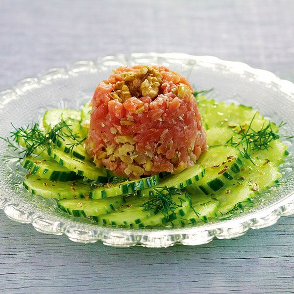 Den Lachs in sehr feine Würfel schneiden. Die Walnusskerne fein hacken. Beides in einer Schüssel mit dem Zitronensaft vermengen und mit Pfeffer abschmecken.