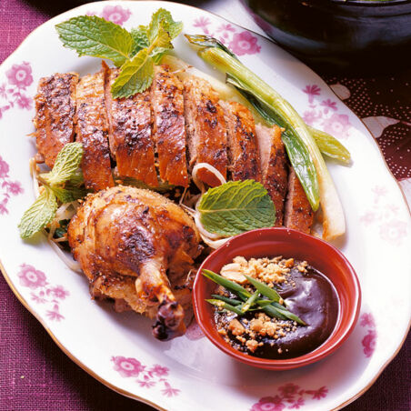 Die zerteilte Ente wird in ihrer südostasiatischen Heimat traditionell mit den Fingern gegessen. Man taucht die Fleischstücke in Hoisinsauce und beißt ab.