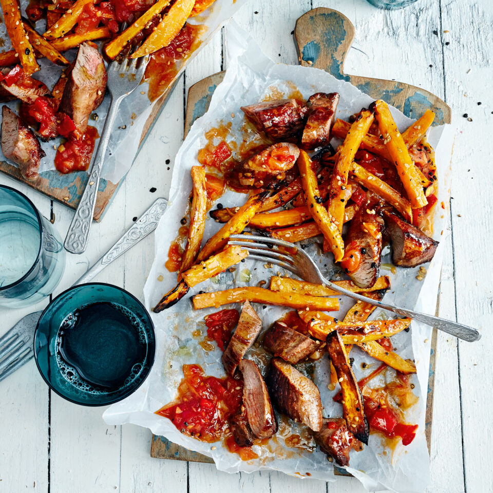 Saftige Lammhappen mit Süßkartoffelpommes und feuriger Sauce: das perfekte Essen für ein Slow-Food-Picknick!