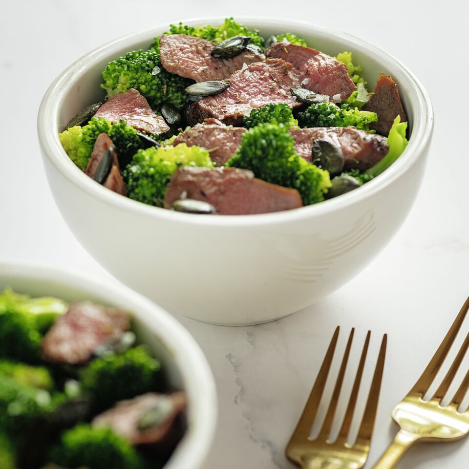 Den Brokkoli in ein Sieb abgießen, auf zwei Schalen verteilen, mit Olivenöl beträufeln und leicht salzen. Mit den Kürbiskernen garnieren. Die Lammfilets nach der Bratzeit in Stücke schneiden und auf dem Brokkoli anrichten.