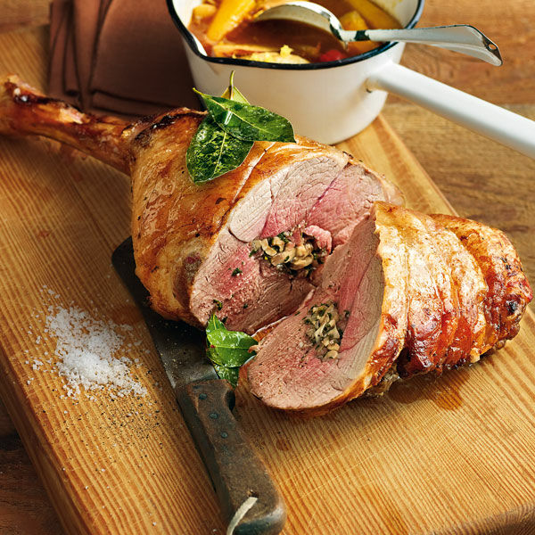 Die zarte Lammkeule wird mit einer aromatischen Mischung aus Pilzen und Kräutern gefüllt. Dazu passt perfekt die feine Gemüsemischung.
