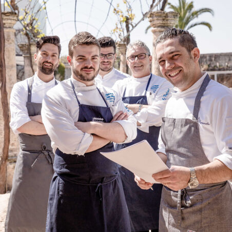 Pietro Sgaramella, 35, stammt aus Andria in Apulien und er ist seiner Mutter schon als kleiner Junge bei der Zubereitung der sonntäglichen Familienessen zur Hand gegangen. Nach Absolvierung der Hotelfachschule kochte er unter anderem mit Pietro Leemann („Joia“) in Mailand, mit Massimiliano Alajmo im „Le Calandre“ (Sarmeola di Rubano) und Don Alfonso im „Le Sirenuse“ (Sant’Agata). Seit gut 5 Jahren ist er als (Chef-)Koch im Restaurant Le Palme der apulischen 5 Sterne-Masseria Maizza beschäftigt.