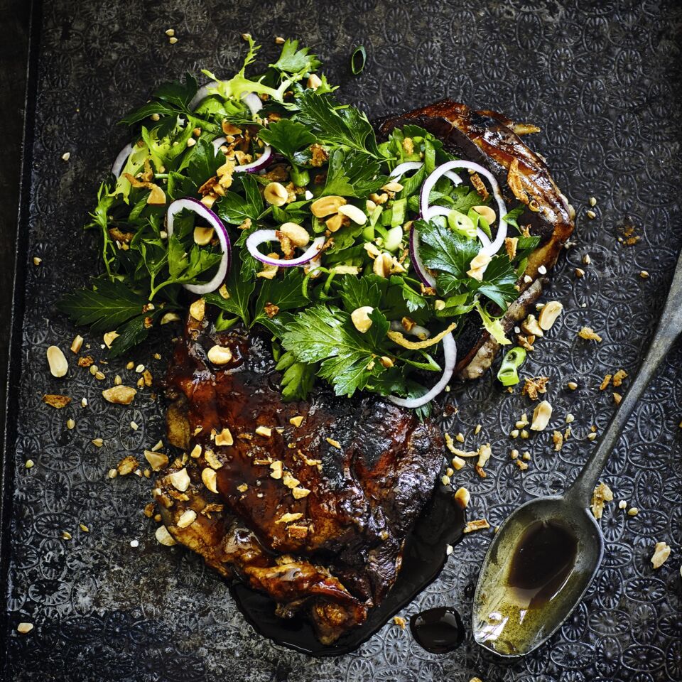 Lammrippe: Backofen auf 100° (Umluft) vorheizen. Die Bauchrippenstücke waschen, trocken tupfen und salzen. Das Öl in einer großen Pfanne erhitzen. Darin die Rippenstücke bei starker Hitze von beiden Seiten scharf anbraten. Dann auf ein Backblech legen und im Ofen (Mitte) ca. 3 Std. garen, bis das Fleisch zart ist. Jetzt die Ofentemperatur auf 200° (Umluft) erhöhen und die Lammrippen »krossen«, also schön knusprig werden lassen. Anschließend mit etwas Lack bepinseln und in weiteren 3 Min. im Ofen karamellisieren lassen. Diesen Vorgang zweimal wiederholen, dabei etwas Lack für einen vierten Durchgang zurückbehalten.