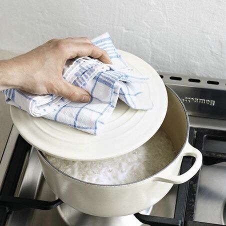 Alles einmal offen aufkochen lassen, dann den Reis umrühren und die Hitze auf die niedrigste Stufe runterschalten. Einen fest schließenden Deckel auflegen.