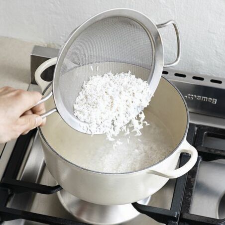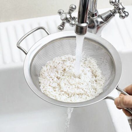 Den Reis in ein engmaschiges Sieb geben. Mit kaltem Wasser abbrausen, damit anhaftendes Reismehl von den Körnern abgewaschen wird. Dann den Reis abtropfen lassen.