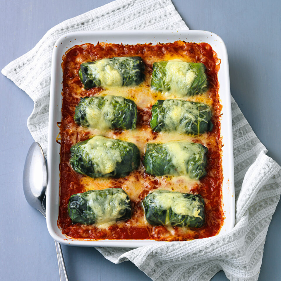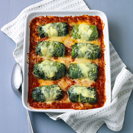 Käse reiben. Die Mangoldblätter mit der Spitze nach vorne auf die Arbeitsfläche legen. Von der Kartoffelmasse jeweils 2-3 EL auf die vordere Hälfte eines Blatts geben und von vorne einrollen. So fortfahren, bis alle Blätter und die Füllung aufgebraucht sind. Die Tomatensauce in eine flache Auflaufform geben, die Rollen hineinsetzen, mit dem geriebenen Käse bestreuen und ca. 20 Min. (Mitte, Umluft 160°) überbacken.