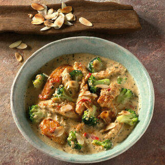Die Mehlschwitze in die Pfanne gießen, aufkochen und 2-3 Min. leise kochen lassen. Crème fraîche unterrühren und die Sauce mit Salz, Pfeffer, restlichem Honig und Limettensaft abschmecken. Das Thai-Basilikum waschen, trockentupfen, fein hacken und unter die Sauce rühren. Lassen Sie sich Spaghettini dazu schmecken.