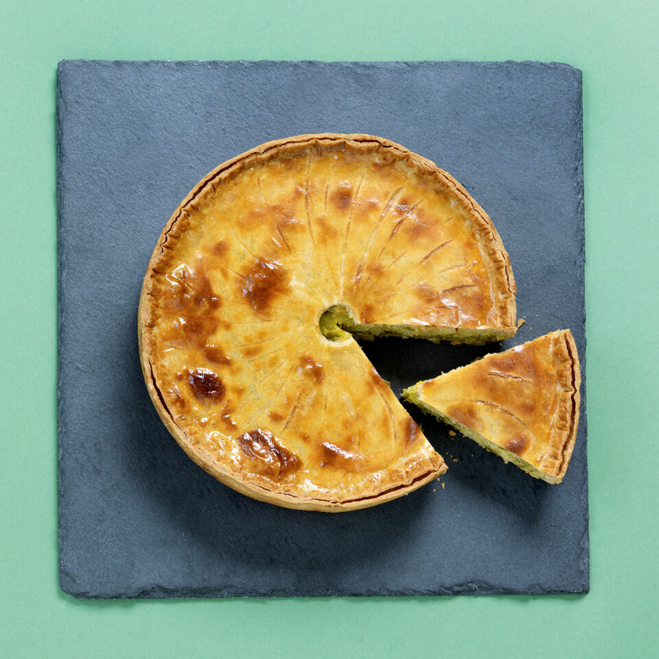 Den übrigen Teig in Formgröße ausrollen, auf den Pie legen und die Teigränder gut zusammenpressen. Mit einem kleinen, spitzen Messer den Teigdeckel nach Belieben dekorativ einritzen. Eine kleine, runde Öffnung in die Mitte stechen, damit der Dampf entweichen kann.