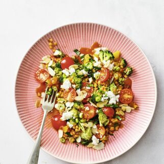 Couscous hinzufügen, alles gründlich verrühren und mit Salz und Pfeffer abschmecken. Schafskäse zerbröseln, mit der restlichen Minze und dem Frühlingszwiebelgrün vermischen. Den lauwarmen Couscous-Salat auf zwei Schalen oder zwei große, weite Gläser (Verrines) verteilen. Mit der Fetamischung bestreuen.