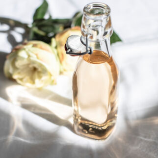 Durch einen Kaffeefilter abseihen. Mit 2 Lavendelblüten und einem Stück Zitronenschale in eine attraktive Flasche geben.