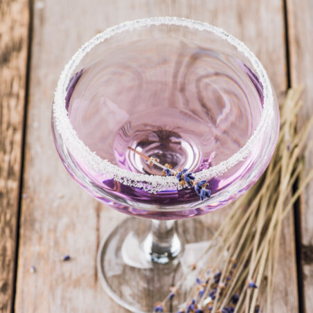 Genieße den Lavendel-Likör pur oder gebe einen Schuss in ein Glas Sekt.
