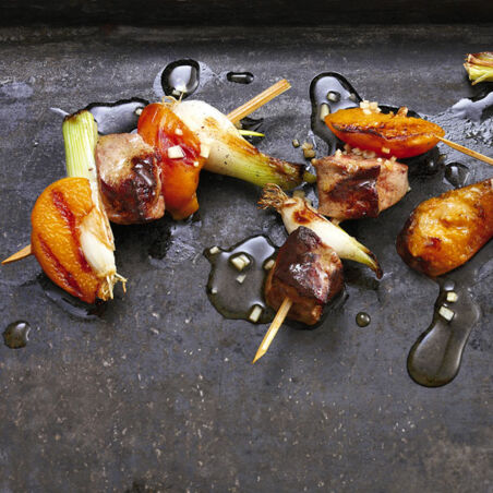Raffinierte Spießchen, wie hier mit Leber und Aprikosen, werden in Spanien gerne als Tapas verzehrt.