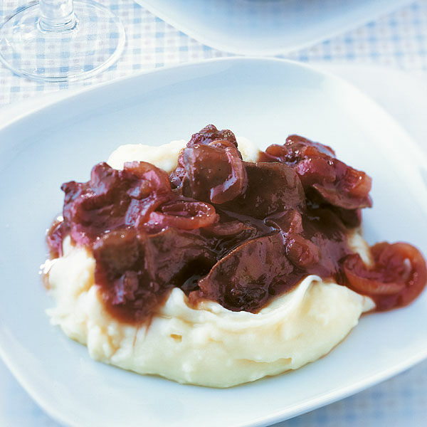 In einer anderen Pfanne 1 EL Öl erhitzen, Lebern von jeder Seite 2 Min. braten, salzen, pfeffern. Mit der Zwiebel-Pflaumen-Sauce anrichten. Dazu Püree servieren.