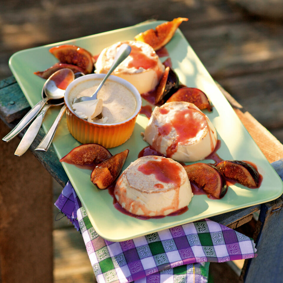 Die Panna cotta aus dem Kühlschrank nehmen. Die Creme mit einem spitzen Messer vom Rand lösen und auf Teller stürzen. Wenn das nicht gleich gelingt, die Unterseite der Förmchen kurz in heißes Wasser tauchen. Die Feigenspalten um die Lebkuchen-Panna-cotta herum anrichten und das Dessert gleich servieren.