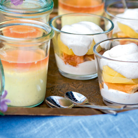 Jeweils 1 TL Lebkuchencreme in die Gläser geben. Die Löffelbiskuits in Stücke brechen, daraufgeben und nach Belieben mit Calvados beträufeln. Die Weißweinäpfel mit etwas Flüssigkeit einschichten und die übrige Lebkuchencreme darauf verteilen.