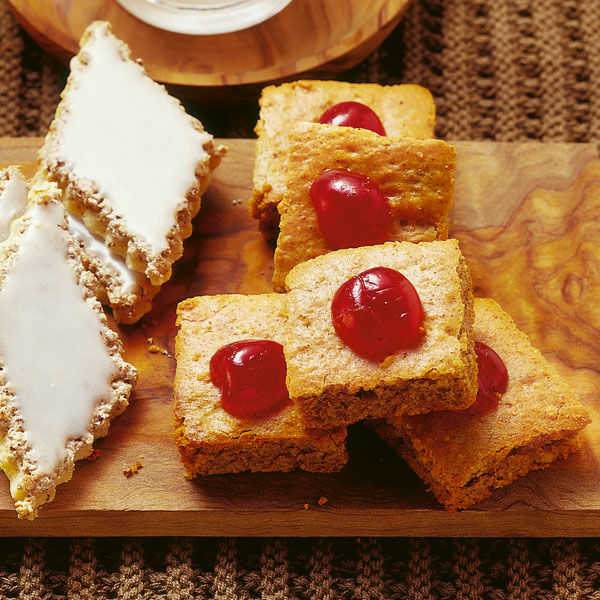 Den Lebkuchenteig gleichmäßig auf das Backblech streichen. Im Ofen (Mitte, Umluft 180°) 20 Min. backen. Herausnehmen und noch warm in 3 x 3 cm große Quadrate schneiden. Eventuell mit halbierten Belegkirschen verzieren.