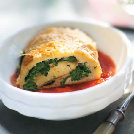 Das Öl in einer großen beschichteten, ofenfesten Pfanne erhitzen. Die Eiermasse hineingeben und bei mittlerer Hitze in 3-5 Min. leicht stocken lassen ‒ die Masse sollte oben noch nicht ganz fest sein. Die Pfanne vom Herd nehmen und den Spinat gleichmäßig auf dem Omelette verteilen, dann vorsichtig aufrollen, den restlichen Parmesan aufstreuen. Die Rolle im Ofen (Mitte) in ca. 10 Min. fertig garen. Zum Servieren in Scheiben schneiden und eventuell mit Tomatensauce oder einfach einem Salat dazu servieren.