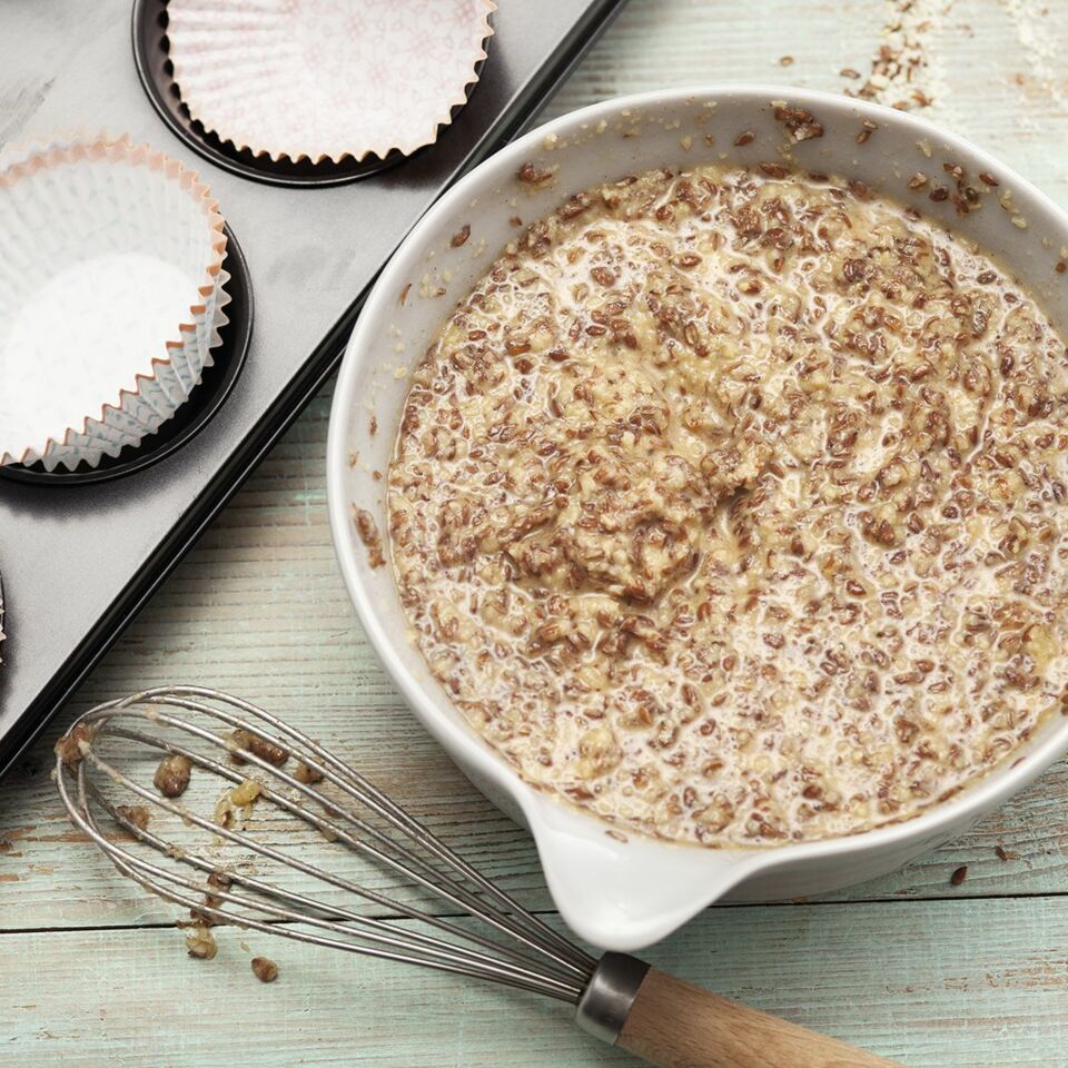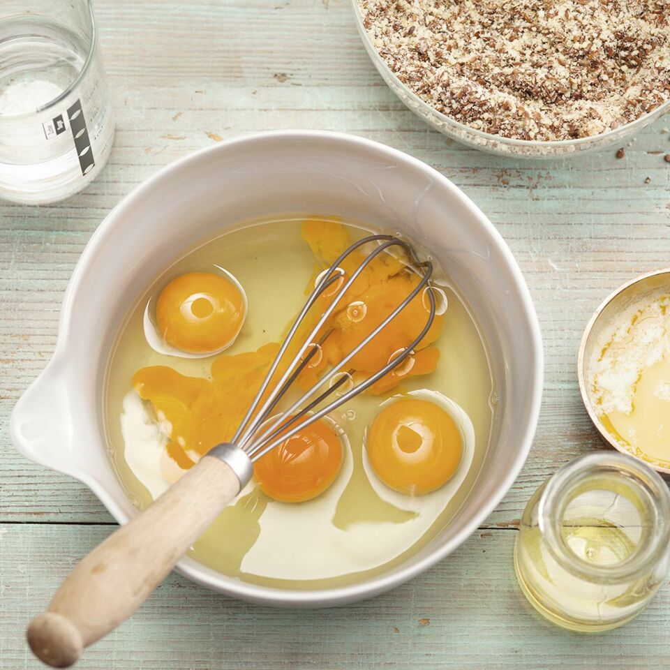 Die Leinsamen-Mandel-Mischung zur Eiermischung geben und kurz unterrühren, bis alles gerade vermischt ist.