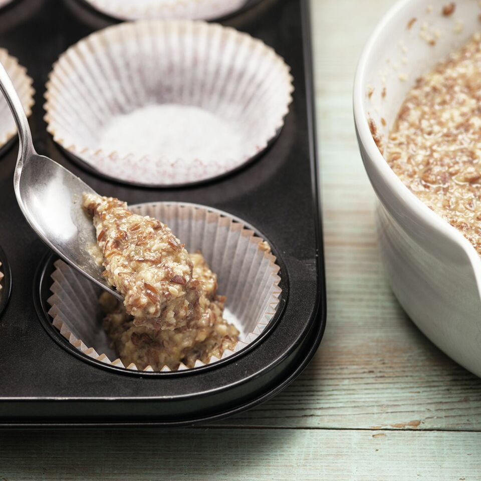 Den Backofen auf 160° vorheizen. Die Papierförmchen in die Vertiefungen der Muffinform setzen oder die Mulden mit Butter einfetten. Leinsamen, Mandeln, Backpulver, Zimt und Salz in einer Schüssel mischen. Die Butter schmelzen lassen.