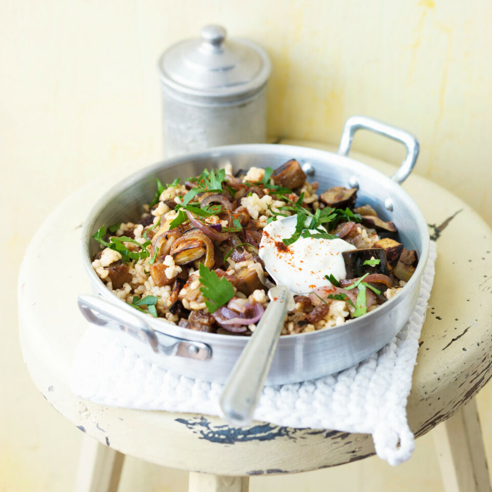 Der libanesische Bulgur wird mit Aubergine und roten Zwiebeln zubereitet. Zimt und Kurkuma geben ihm orientalische Würze.