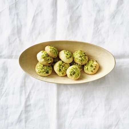 Den Backofen auf 175° vorheizen. Zwei Backbleche mit Backpapier auslegen. Die Pistazienkerne auf einen Teller geben.