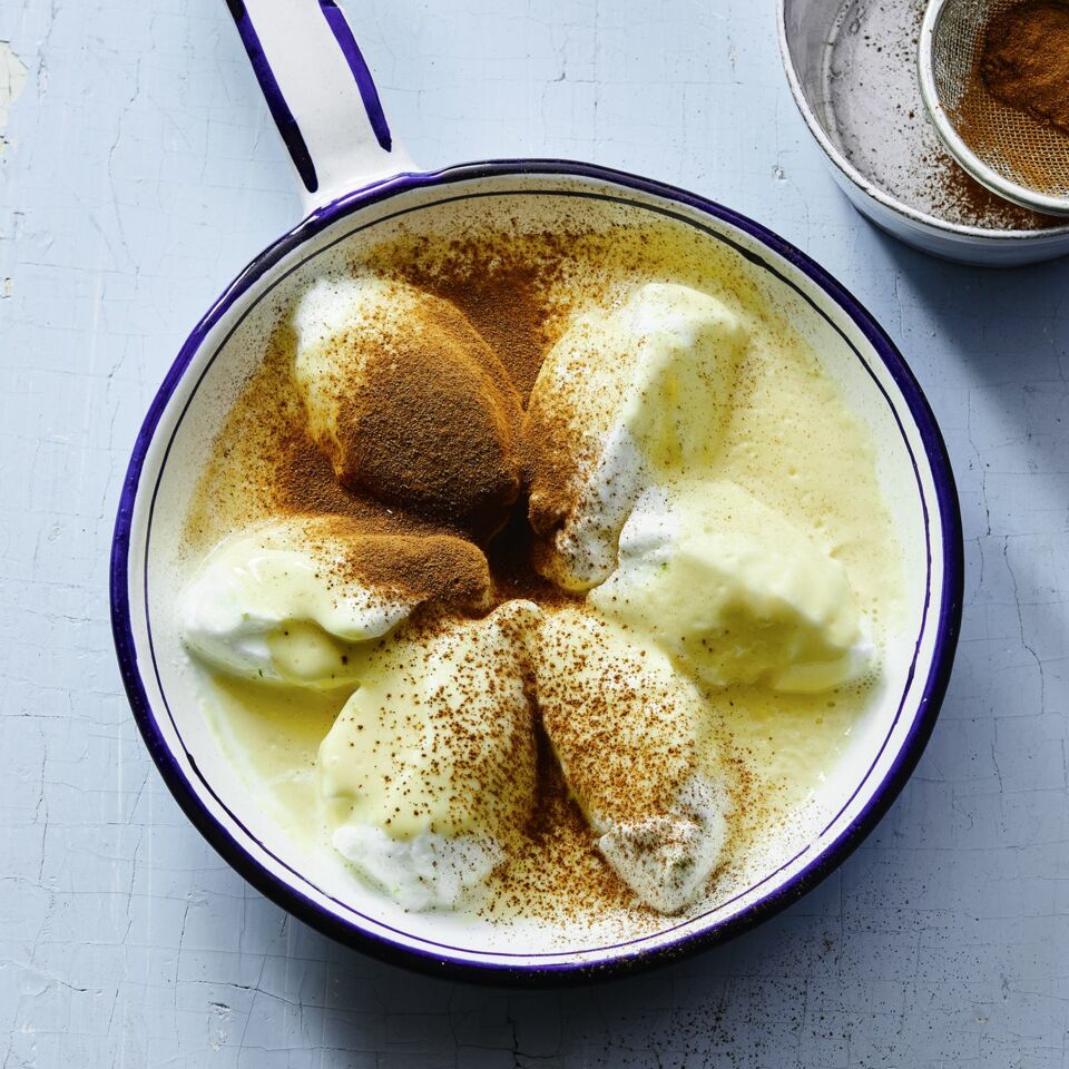 Mit einem Servierlöffel (ca. 7 cm) eine Portion der Eiweißmasse entnehmen und in die siedende Milch legen. Jeweils drei bis vier Portionen gleichzeitig im Topf nebeneinander garen. Nach ca. 30 Sek. die Eischneewölkchen wenden und weitere 30 Sek. ziehen lassen. Die fertigen Wölkchen mit einem Schaumlöffel aus der Milch heben und in die Auflaufform legen. So verfahren, bis die gesamte Eiweißmasse aufgebraucht ist.