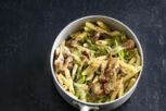 Zugedeckt bei starker Hitze zum Kochen bringen. Dann die Nudeln offen bei mittlerer bis starker Hitze 10 - 12 Min. kochen lassen. Dabei immer wieder umrühren, je mehr Flüssigkeit verkocht ist, desto öfter. Die Nudeln probieren. Sind sie nicht durch, bei Bedarf noch 3 - 5 EL Wasser hinzufügen und kurz weiterköcheln lassen.