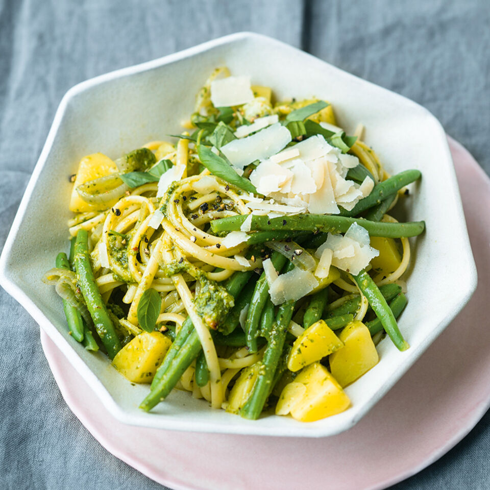 Die Nudeln in eine große Pfanne mit hohem Rand oder einen weiten Topf geben. Kartoffel, Schalotte, Knoblauch, Basilikumstiele und die gefrorenen Bohnen dazugeben. 600 ml kaltes Wasser, das Öl und 1 TL Salz hinzufügen.