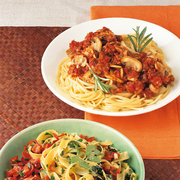 Inzwischen die Linguine nach Packungsanweisung in reichlich kochendem Salzwasser bissfest garen. Abgießen und abtropfen lassen. Die Pilze zur Sauce geben, noch einmal aufkochen, mit Salz und Pfeffer abschmecken. Die Nudeln untermengen.